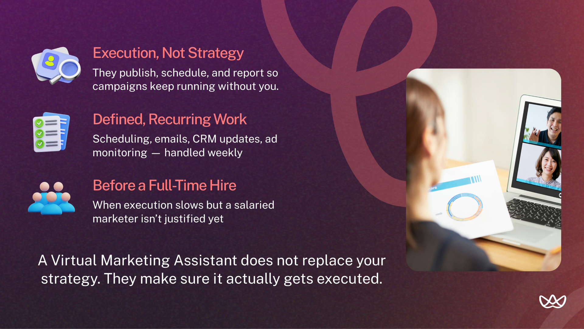 You may consider hiring a virtual marketing assistant when marketing execution becomes consistent enough to delegate but doesn’t yet justify another full-time role.